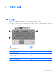 1 포인팅 장치 사용 부품 설명 (1) 포인팅 스틱 포인터를 움직여서 화면에 표시된 항목을 선택하거나 활성화합니 다. (2) 왼쪽 포인팅 스틱 버튼 외장 마우스의 왼쪽 버튼과 같은 기능을 수행합니다. (3) 터치패드* 포인터를 움직여서 화면에 표시된 항목을 선택하거나 활성화합니 다. (4) 왼쪽 터치패드 버튼* 외장 마우스의 왼쪽 버튼과 같은 기능을 수행합니다. (5) 오른쪽 포인팅 스틱 버튼 외장 마우스의 오른쪽 버튼과 같은 기능을 수행합니다. (6) 터치패드 스크롤 영역* 위쪽 또는 아래쪽으로 스크롤합니다. (7) 오른쪽 터치패드 버튼* 외장 마우스의 오른쪽 버튼과 같은 기능을 수행합니다. *이 표에서는 기본 설정에 대해 설명합니다. 포인팅 장치 기본 설정을 확인 및 변경하려면 시작 > 장치 및 프린터를 선택합니 다. 그런 다음 컴퓨터를 나타내는 장치를 마우스 오른쪽 버튼으로 누르고 마우스 설정을 선택합니다.