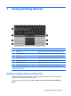 1 Using pointing devices Component Description (1) Pointing stick Moves the pointer and selects or activates items on the screen. (2) Left pointing stick button* Functions like the left button on an external mouse. (3) TouchPad* Moves the pointer and selects or activates items on the screen. (4) Left TouchPad button* Functions like the left button on an external mouse. (5) Right pointing stick button* Functions like the right button on an external mouse.