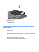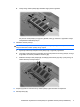 13. Dokręć śrubę pokrywy komory modułu pamięci (3). 14. Włóż baterię na miejsce. 15. Ustaw komputer prawą stroną do góry, a następnie podłącz ponownie zewnętrzne źródło zasilania i urządzenia zewnętrzne. 16. Włącz komputer. Dodawanie modułu pamięci do podstawowego gniazda modułu pamięci Aby dodać moduł pamięci do podstawowego gniazda modułu pamięci, wykonaj następujące kroki: 1. Zapisz swoją pracę. 2. Wyłącz komputer.
