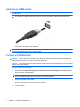 Ansluta en USB-enhet VIKTIGT: Undvik skador på USB-kontakten genom att använda så lite kraft som möjligt när du ansluter en USB-enhet. ▲ Du ansluter en USB-enhet till datorn genom att ansluta enhetens USB-kabel till USB-porten. Ett ljud hörs när enheten har upptäckts. OBS! Första gången du ansluter en USB-enhet visas meddelandet ”Installerar drivrutinsprogram” i meddelandefältet längst till höger i Aktivitetsfältet.