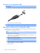 Conexión de un dispositivo USB PRECAUCIÓN: Para evitar dañar un conector USB, utilice la mínima fuerza posible para conectar un dispositivo USB. ▲ Para conectar un dispositivo USB al equipo, conecte el cable USB del dispositivo al puerto USB. Oirá un sonido cuando se detecte el dispositivo. NOTA: La primera vez que conecte un dispositivo USB, aparecerá el mensaje “Instalando software de controlador de dispositivo” en el área de notificación (en el extremo derecho de la barra de tareas).