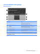 Részegység Leírás (1) esc billentyű Az fn billentyűvel együtt lenyomva megjeleníti a rendszerinformációkat. (2) fn billentyű A funkcióbillentyűkkel és az esc billentyűvel együtt lenyomva a gyakran használt rendszerműveletek végrehajtására szolgál. (3) Windows-billentyű A Windows operációs rendszer Start menüjét jeleníti meg. (4) Helyi menü billentyű A mutató alatt lévő elem helyi menüjét jeleníti meg.