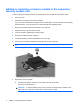 Adding or replacing a memory module in the expansion memory module slot To add or replace a memory module in the expansion memory module slot, follow these steps: 1. Save your work. 2. Shut down the computer and close the display. If you are not sure whether the computer is off or in Hibernation, turn the computer on by pressing the power button. Then shut down the computer through the operating system. 3. Disconnect all external devices connected to the computer. 4.