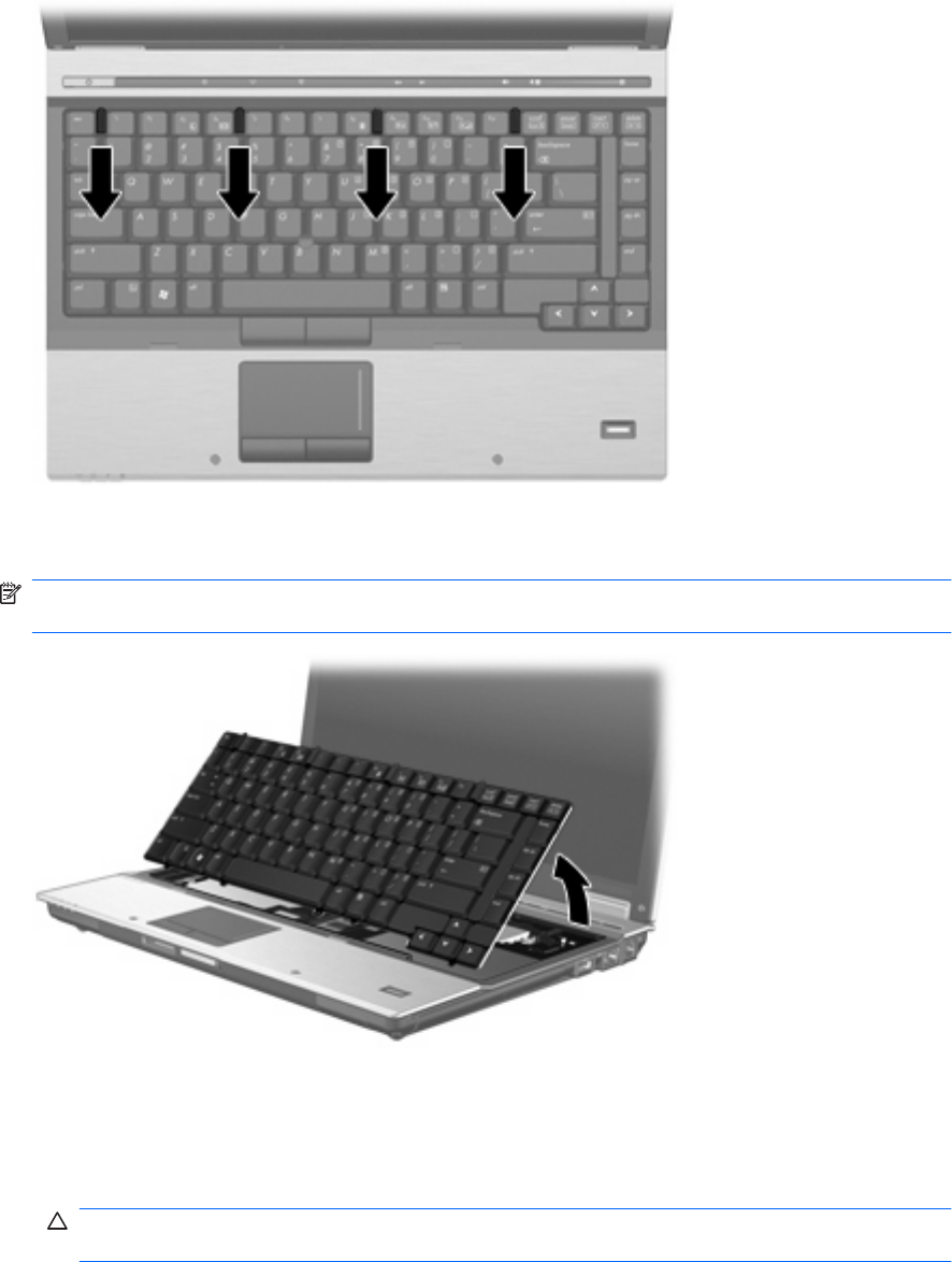 키보드가 컴퓨터의 팜 레스트에 결합될 때까지 키보드의 위쪽 가장자리를 조심스럽게 들어 올립