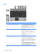Beeldscherm 8 Component Beschrijving (1) Omgevingslichtsensor Hiermee wordt de helderheid van het beeldscherm automatisch aangepast aan het licht in uw omgeving. (2) Interne microfoons (2) Hiermee kunt u geluid opnemen. (3) HP Webcam Hiermee kunt u videobeelden vastleggen en foto's maken. (4) Lampje van de HP Webcam Aan: de geïntegreerde camera is in gebruik.