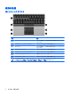ディスプレイ 名称 10 説明 (1) 周辺光センサ 周囲の明るさに基づいて画面の輝度を自動的に調節します (2) 内蔵マイク(×2) サウンドを録音します (3) HP Web カメラ 動画を録画したり、静止画像を撮影したりします (4) HP Web カメラ ランプ 点灯: 内蔵カメラが使用中です (5) キーボード ライト キーボード ライト ボタンを押すと、暗い場所でキーボードを明 るく照らします (6) キーボード ライト ボタン キーボード ライトが開いて点灯します 第 2 章 各部の名称