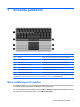 1 Använda pekdonen Komponent Beskrivning (1) Pekdon Flyttar pekaren och väljer eller aktiverar objekt på skärmen. (2) Vänster pekdonsknapp Fungerar som vänsterknappen på en extern mus. (3) Styrplatta* Flyttar pekaren och väljer eller aktiverar objekt på skärmen. (4) Vänster knapp på styrplattan* Fungerar som vänsterknappen på en extern mus. (5) Höger pekdonsknapp Fungerar som högerknappen på en extern mus. (6) Styrplattans rullningsområde* För rullning uppåt och nedåt.