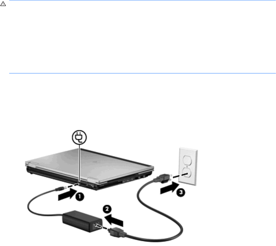 1. Tilslut vekselstrømsadapterkablet til strømstikket (1) på computeren.