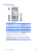 staattinen sähkö, vaurioiden estäminen 48 suojaaminen HP Business PC Security -lukko 45 riippulukko 45 vaijerilukko 44 T takapaneelin osat 4 tekniset tiedot muisti 14 tietokone 39 tietokoneen käyttöohjeet 49 tulolinjan liitin 4 tuotetunnuksen sijainti 7 U USB-portit etupaneeli 2 takapaneeli 4 V valmisteleminen kuljetusta varten 50 verkkoliitin 4 VGA-näytön liitin 4 virransyöttö 39 W Windows-näppäin 5 Ä ääniliittimet 2, 4 52 Hakemisto FIWW