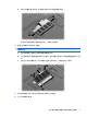 在扩展内存模块插槽中添加或更换内存模块 要在扩展内存模块插槽中添加或更换内存模块,请执行以下步骤: 1. 保存所做的工作。 2. 关闭笔记本计算机并合上显示屏。 如果您无法确定笔记本计算机是已经关闭还是处于休眠模式,请先按电源按钮打开计算机,然后通 过操作系统将其关闭。 3. 断开所有与计算机相连的外接设备。 4. 将电源线插头从交流电源插座上拔下。 5. 翻转笔记本计算机,将其放在平整的表面上。 6. 从笔记本计算机中取出电池。 7. 拧开内存模块盒盖的螺钉 (1)。 8. 提起内存模块盒盖 (2),使其脱离计算机。 注: 9. 如果扩展内存模块插槽中未安装内存模块,则跳过步骤 9 并继续执行步骤 10。 要取出内存模块,请执行以下操作: a.