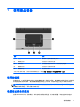 1 使用指点设备 组件 说明 (1) 触摸板* 移动指针,选择或激活屏幕上的项。 (2) 触摸板左按钮* 功能类似于外接鼠标的左键。 (3) 指纹识别器 允许使用指纹登录 Windows,而无需使用密码登录。 (4) 触摸板右按钮* 功能类似于外接鼠标的右键。 (5) 触摸板滚动区 向上或向下滚动。 *此表介绍的是默认设置。 要查看或更改触摸板首选项,请选择开始 > 控制面板 > 打印机和其它硬件 > 鼠标。 使用触摸板 要移动指针,可沿您要移动指针的方向在触摸板表面上滑动您的手指。 触摸板按钮的使用方式与外接鼠 标对应键的使用方式相同。 要使用触摸板垂直滚动区上下滚动,请在滚动区上面上下滑动您的手指。 注: 如果您使用触摸板移动指针,则必须先从触摸板上抬起手指,然后转到滚动区。如果手指直接从 触摸板滑动到滚动区,则不会激活滚动功能。 设置指点设备首选项 使用 Windows® 中的“鼠标属性”来自定义指点设备的设置,比如按钮配置、单击速度和光标选项。 使用触摸板 1