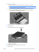 . Fjern minnebrønndekselet (2) fra datamaskinen. MERK: Hvis det ekstra minnemodulsporet er tomt, hopper du over trinn 9 og fortsetter til trinn 10. 9. Slik tar du ut minnemodulen: a. Løsne festeklipsene (1) på hver side av minnemodulen. Minnemodulen vippes oppover. FORSIKTIG: For å unngå skade på minnemodulen må du bare holde den i kantene. Ikke ta på komponentene til minnemodulen. b. Ta tak i kantene på minnemodulen (2), og trekk den forsiktig ut av minnemodulsporet.