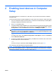 2 Enabling boot devices in Computer Setup The computer will boot to a USB device or a NIC device only if the device has first been enabled in Computer Setup. To start Computer Setup and enable a USB device or a NIC device as a boot device, follow these steps: 1. Turn on or restart the computer, and then press esc while the “Press the ESC key for Startup Menu” message is displayed at the bottom of the screen. 2. Press f10 to enter BIOS Setup. 3.