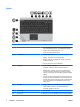 Component Description (7) ● Off: Computer sound is on. ● On: Computer sound is off. Volume mute light (8) Volume down light Blinking: The volume scroll zone is being used to decrease speaker volume. (9) Volume up light Blinking: The volume scroll zone is being used to increase speaker volume. *The 2 wireless lights display the same information. The light on the wireless button is visible only when the computer is open.