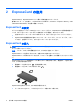2. カードを ExpressCard スロットに挿入し、しっかり装着されるまで押し込みます。 デバイスが検出されたときに音が鳴り、場合によっては使用可能なオプションのメニューが表示 されます。 注記: ExpressCard を初めて挿入した場合は、タスクバーの右端の通知領域に[デバイス ドラ イバ ソフトウェアをインストールしています]というメッセージが表示されます。 注記: 装着されている ExpressCard は、使用されていなくても電力を消費します。節電するには、 使用していない ExpressCard を停止するか、取り出してください。 ExpressCard の停止と取り出し 注意: データの損失やシステムの応答停止を防ぐため、ExpressCard を取り出す前に ExpressCard を停止してください。 1. 情報を保存し、ExpressCard に関連するすべてのプログラムを閉じます。 注記: データ転送を停止するには、オペレーティング システムの[コピーしています]ウィンド ウで[キャンセル]をクリックします。 2.