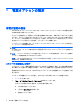 手順 3:バッテリを放電する バッテリの放電中は、コンピュータの電源を入れたままにしておく必要があります。バッテリは、コ ンピュータを使用しているかどうかにかかわらず放電できますが、使用している方が早く放電が完了 します。 ● 放電中にコンピュータを放置しておく場合は、放電を始める前に作業中のファイルを保存してく ださい。 ● 通常、省電力設定を利用している場合は、このセクションの手順で放電させると、放電処理中の システムの動作が以下のようになることに注意してください。 ◦ モニタは自動的にオフになりません。 ◦ コンピュータがアイドル状態のときでも、ハードドライブの速度は自動的に低下しません。 ◦ システムによるハイバネーションは起動されません。 バッテリを放電するには、以下の手順で操作します。 1. コンピュータを外部電源から切り離します。ただし、コンピュータの電源は切らないでくださ い。 2.