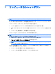 スタンバイを終了するには、以下の操作を行います。 ▲ 電源ボタンを押します。 スタンバイを終了すると、電源ランプが点灯し、中断した時点の作業が元通りに画面に表示され ます。 注記: コンピュータがスタンバイを終了するときにパスワードの入力を必要とするように設定した 場合は、作業画面に戻る前に Windows パスワードを入力する必要があります。 ハイバネーションの起動と終了 システムは、バッテリ電源の使用時に操作しない状態が 30 分続いた場合、または完全なローバッテ リ状態に達した場合に、ハイバネーションを起動するように出荷時に設定されています。 注記: 外部電源の使用時には、ハイバネーションは起動されません。 電源設定およびタイムアウトは、Windows の[コントロール パネル]の[電源オプション]を使用して変 更できます ハイバネーションを起動するには、以下の手順で操作します。 1. [スタート]→[終了オプション]の順に選択します。 2. shift キーを押しながら[休止状態]を選択します。 [休止状態]が表示されない場合は、以下の手順で操作します。 a.