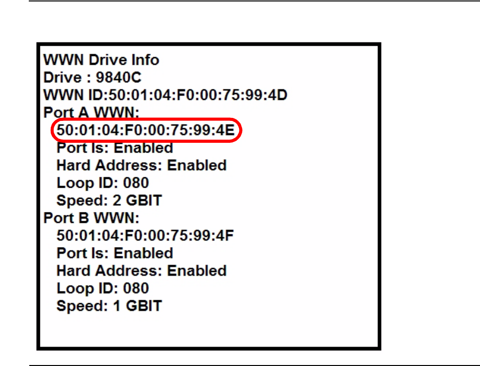fiber cable is plugged into Port A on the tape drive. The WWN for Port A is