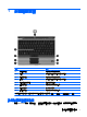 ▲ 若要關閉並關上鍵盤指示燈,請輕按鍵盤指示燈,直到其卡住定位。 使用快速鍵 快速鍵是 fn 鍵 (1) 和 esc 鍵 (2) 或某個功能鍵 (3) 的組合。 f3、f4 與 f8 到 f11 鍵上的圖示代表快速鍵功能。快速鍵功能與程序將會在下列各節中進行說明。 4 功能 快速鍵 顯示系統資訊。 fn+esc 啟動睡眠。 fn+f3 切換螢幕影像。 fn+f4 第 2 章 使用鍵盤
