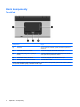 Indikátory Komponenta Popis (1) ● Modrá: Je zapnuto integrované bezdrátové zařízení, například zařízení pro bezdrátovou místní síť WLAN, modul HP pro širokopásmové bezdrátové připojení anebo zařízení Bluetooth®. ● Žlutá: Všechna bezdrátová zařízení jsou vypnuta. ● Svítí: Počítač je zapnutý. ● Bliká: Počítač je v úsporném režimu. ● Bliká rychle: Měl by být připojen adaptér střídavého proudu s vyšším jmenovitým výkonem. ● Nesvítí: Počítač je vypnutý nebo v režimu spánku.