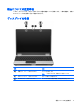 製品についての注意事項 このユーザ ガイドでは、ほとんどのモデルに共通の機能について説明します。一部の機能は、お使い のコンピュータでは使用できない場合があります。 ディスプレイの各部 名称 (1) 説明 内蔵マイク(×2) (一部のモデルのみ) サウンドを録音します 注記: 一部のモデルでは、内蔵マイクの数は 1 つです (2) Web カメラ ランプ(一部のモデルのみ) 点灯: 内蔵カメラが使用中です (3) HP Web カメラ(一部のモデルのみ) オーディオの録音と動画の録画、静止画像の撮影をします 製品についての注意事項 3