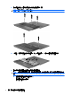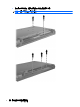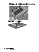 - 1 新增或更換記憶體模組 此電腦的鍵盤下方有一個記憶體模組置放處。將記憶體模組加入空的擴充記憶體模組插槽,或升級主要 記憶體模組插槽中的現有記憶體模組,就可提高電腦的記憶體容量。 警告! 為避免觸電或損壞設備的風險,請先拔下電源線並取出所有電池,然後再安裝記憶體模組。 注意: 釋放靜電 (ESD) 會使電子組件受損。開始執行任何程序之前,您必須先觸碰接地的金屬物體, 以確保釋放身上的靜電。 附註: 若要在新增第二個記憶體模組時使用雙通道組態,請確定兩個記憶體模組的大小相同。 若要新增或更換記憶體模組: 1. 儲存您的工作。 2. 關閉電腦並闔上顯示器。 如果您不確定電腦是否已關機或處於休眠模式,請短暫按下電源按鈕開啟電腦,然後再透過作業系 統關閉電腦。 3. 中斷所有外接式裝置與電腦的連接。 4. 拔下電源線。 5. 將電腦翻轉,以底部朝上放置於平面,電池插槽朝向您。 6.