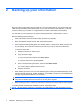- 2 Backing up your information Recovery after a system failure is as complete as your most current backup. You should create your initial backup immediately after software setup. As you add new software and data files, you should continue to back up your system on a regular basis to maintain a reasonably current backup. You can back up your information to an optional external hard drive, a network drive, or discs.