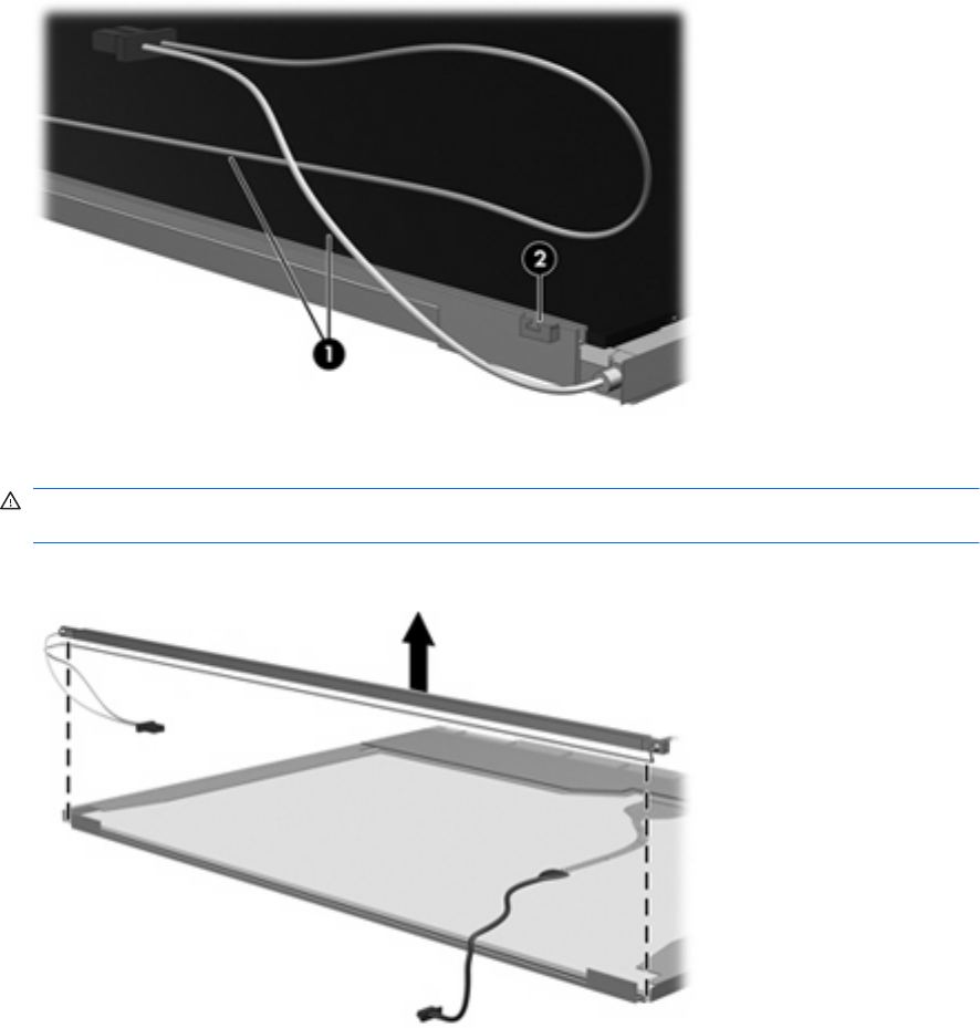 15. Remove the backlight cables (1) from the clip (2) in the display panel.