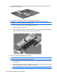 - 12. Työnnä näppäimistöä (1) näyttöyksikköä kohti ja käännä näppäimistö ylösalaisin (2) siten, että muistilokero tulee näkyviin. 13. Jos olet vaihtamassa muistimoduulia, irrota nykyinen muistimoduuli: VAROITUS: Voit estää muistimoduulia vahingoittumasta käsittelemällä sitä ainoastaan reunoista. Älä kosketa muistimoduulin komponentteja. a. Vedä muistimoduulin sivuilla olevia pidikkeitä (1) ulospäin. Muistimoduuli kallistuu ylöspäin. b.
