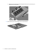 - 11. Odkręć śruby z klawiatury. Komputer zawiera 2 lub 3 śruby do odkręcenia. UWAGA: Należy korzystać z ilustracji, która najdokładniej odzwierciedla wygląd posiadanego komputera. 12. Przesuń klawiaturę (1) w stronę wyświetlacza, a następnie obróć klawiaturę spodem do góry (2) by odsłonić wnękę pamięci. 13. Jeśli wymieniasz moduł pamięci, wyjmij istniejący moduł pamięci: OSTROŻNIE: Aby nie uszkodzić modułu pamięci, należy trzymać go za krawędzie. Nie należy dotykać elementów modułu pamięci. a.