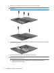 - 20. Wkręć śruby z obszaru baterii. Komputer zawiera 2 lub 3 śruby do wkręcenia. UWAGA: Należy korzystać z ilustracji, która najdokładniej odzwierciedla wygląd posiadanego komputera. 21. Umieść komputer na płaskiej powierzchni spodnią stroną do góry i zamontuj baterię. 22. Podłącz zasilanie zewnętrzne oraz urządzenia zewnętrzne. 23. Włącz komputer.