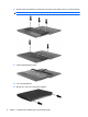 - 8. Vend computeren med skærmen opad, og fjern derefter de to skruer fra computerens bagkant. 9. Åbn computeren helt. 10. Skyd kontaktdækslet lige bagud mod skærmen, og fjern det derefter. 11. Fjern skruerne fra tastaturet. Computeren er forsynet med to eller tre skruer, som skal fjernes. BEMÆRK: Se den illustration, der ligner din computer mest.
