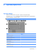 - 1 Uporaba kazalnih naprav Komponenta Opis (1) Sledilna ploščica* Premakne kazalec in izbere ali aktivira elemente na zaslonu. (2) Levi gumb sledilne ploščice* Funkcije kot na levi tipki zunanje miške. (3) Območje za pomikanje na sledilni ploščici Drsi gor ali dol. (4) Desni gumb sledilne ploščice* Funkcije kot na desni tipki zunanje miške. * V tej tabeli so opisane privzete nastavitve.