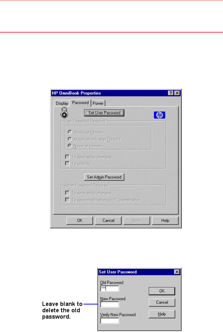 1. Click Start, HP User Tools, Setup, OmniBook, Password.