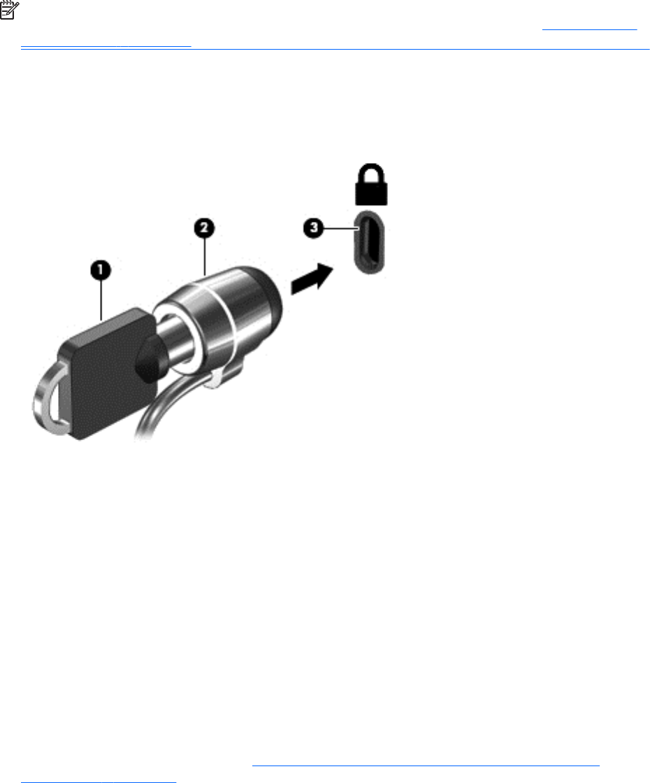 3. Įkiškite kabelio fiksatorių į apsauginio kabelio lizdą kompiuteryje (3) ir užrakinkite kabelio