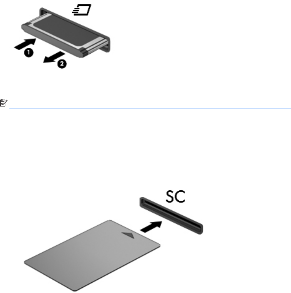 a. 輕輕將 ExpressCard (1) 向內壓,解除鎖定。