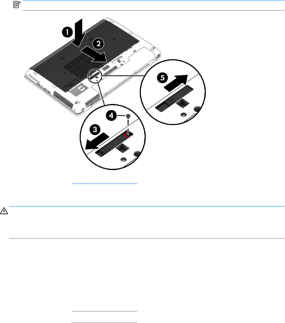 4. 讓電池插槽朝向您,將底蓋釋放閂推向左邊 (3),如果您有需要,也可以裝上選用的螺絲並將它鎖