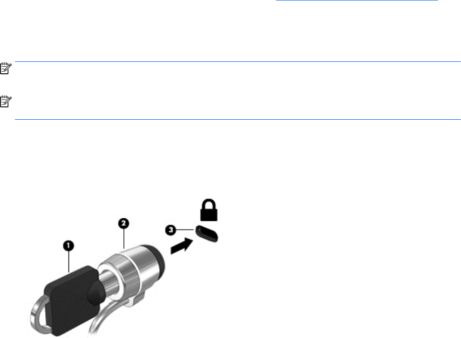 3. Insira o fecho do cabo de segurança na ranhura do cabo de segurança no computador (3) e tranque o