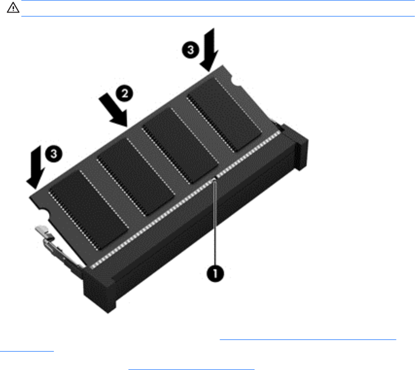 c. Jemne zatláčajte na ľavý a pravý okraj pamäťového modulu (3), kým prídržné svorky