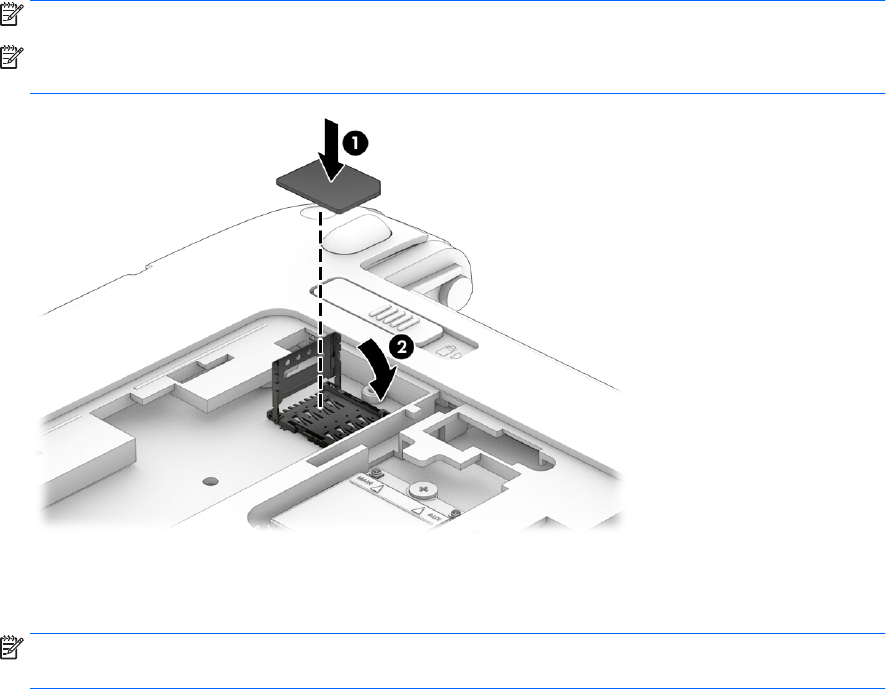została pewnie osadzona. Obróć zawias (2) w dół, aby zabezpieczyć kartę SIM w złączu.