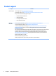 Product support Topic Product support Location For U.S. support, go to http://www.hp.com/go/contactHP. For worldwide support, go to http://welcome.hp.com/country/us/en/wwcontact_us.html. Here you can access the following types of support: Warranty information ● Chat online with an HP technician ● Obtain email support ● Find support telephone numbers ● Locate an HP service center To locate warranty information, go to http://www.hp.com/support/warranty-lookuptool.