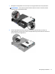 a. Trek de batterijklem naar achteren (1) en til de batterij uit de houder (2).