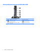 Priekšējā paneļa komponenti (ProDesk 400) 1 Divstāvokļu strāvas poga 4 Mikrofona savienotājs 2 Cietā diska darbības indikators 5 Austiņu savienotājs 3 USB 3.0 pieslēgvietas PIEZĪME. Kad dators ir ieslēgts, strāvas indikators parasti ir baltā krāsā. Ja tas mirgo sarkanā krāsā, datoram ir radusies problēma, un tas rāda diagnostikas kodu. Skatiet Problēmu novēršanas rokasgrāmatā, lai uzzinātu koda skaidrojumu.
