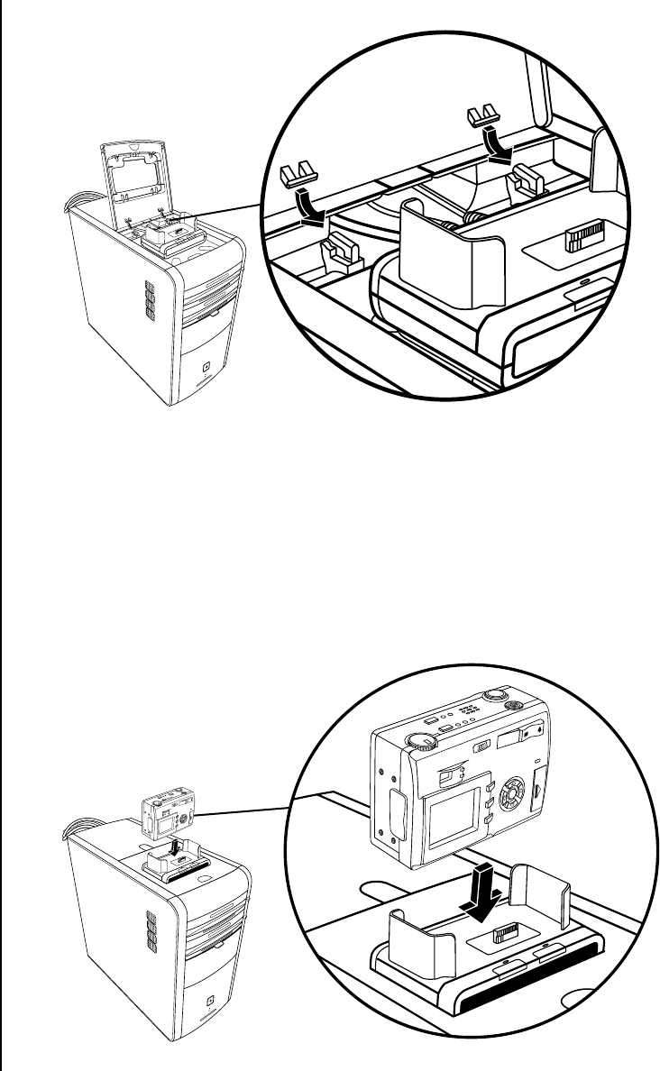 6 Insert the camera: Hold the camera over the camera cradle (R in figure 7) with
