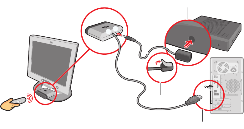 3 Plug the remote control sensor cable into a USB connector (D) on the back of the