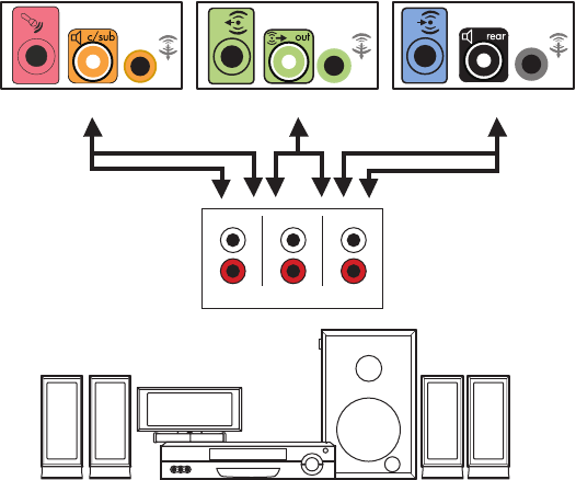 To connect a six-channel (5.1 speaker) home audio system to the computer: