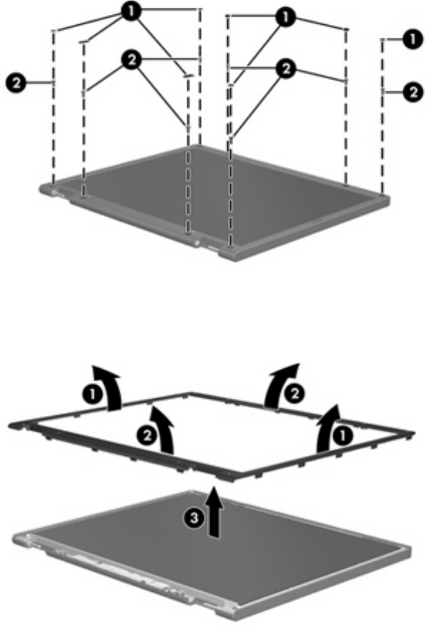 1. Remove all screw covers (1) and screws (2) that secure the display bezel to the display assembly.