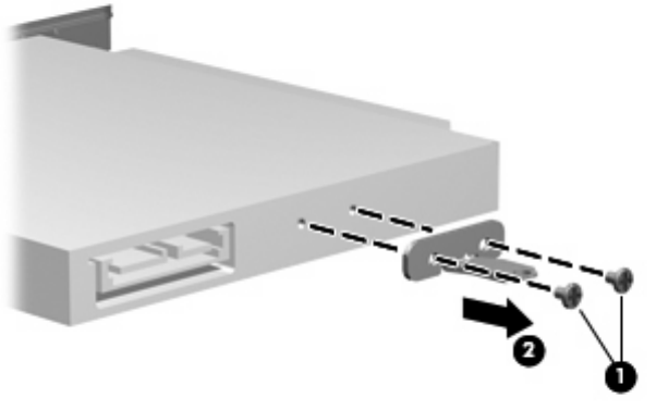 7. Remove the two Phillips PM2.0×3.0 screws (1) that secure the optical drive bracket to the optical