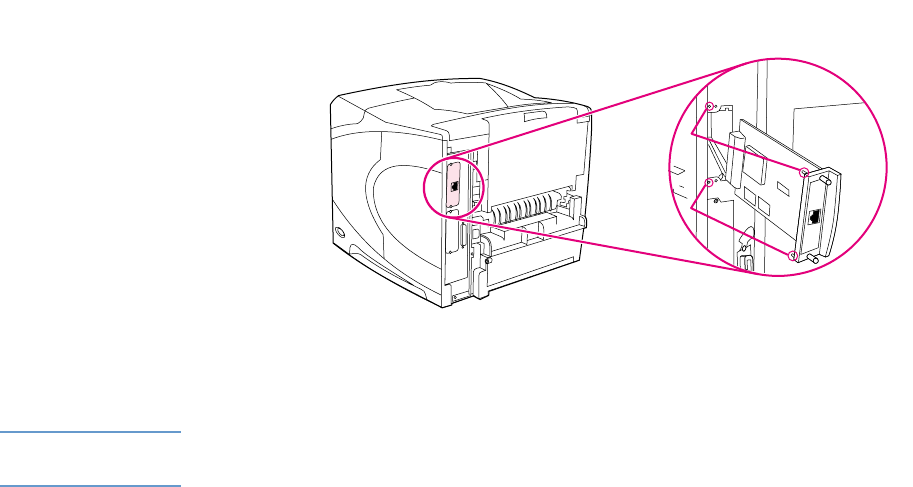 2 Na zadní straně tiskárny odšroubujte dva šrouby a odejměte krytku zásuvky EIO 1 nebo EIO 2.