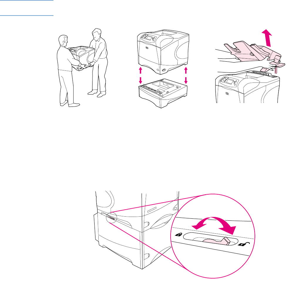 Spojení doplňkových zásobníků, podavačů a úložné skříňky se spodní částí tiskárny je možné zajistit proti